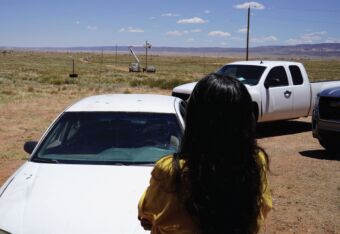 Navajo resident, Esther Whiterock, watches as crews build an electrical line to her home. Photos by Allison Ellingson/MEC
